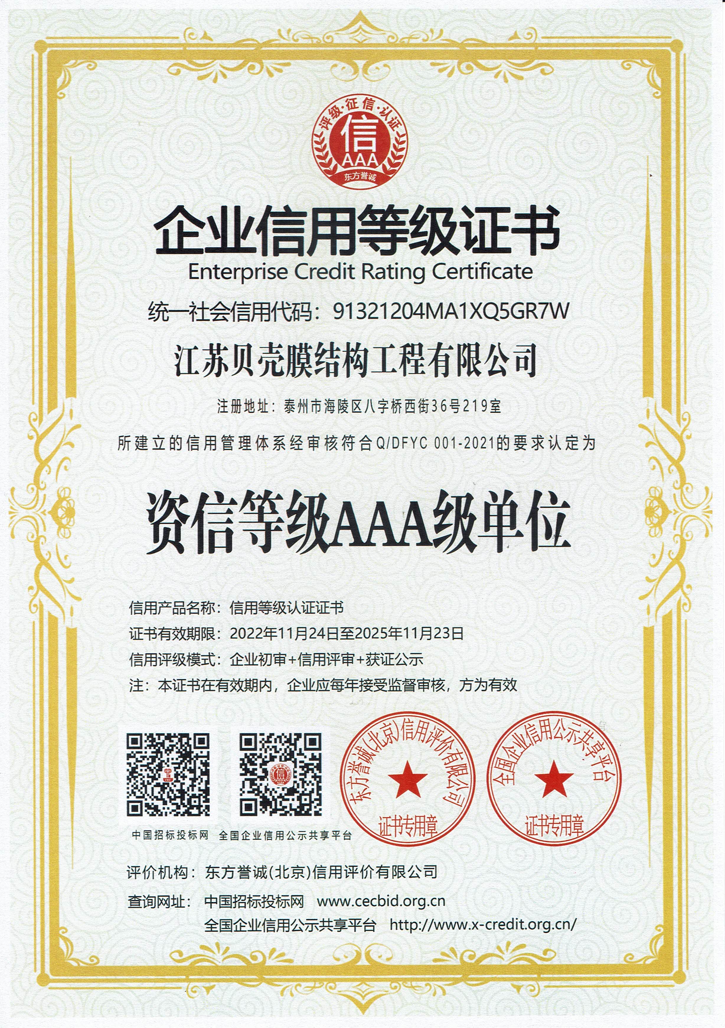 企業(yè)信用等級(jí)證書(資信等級(jí)AAA單位)
